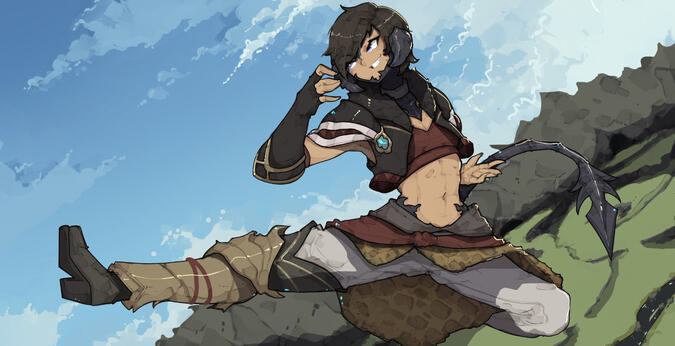 If you'd like to learn the story of a footstep, seek out the girl pressing them into the grass.An affable nomad with a smile and attitude truly befitting of a tomboy, Izumi has made it her life goal to aggregate as many stories from all walks of life as she can. Mundane or fantastical, nothing disinterests her. She are no grand motives or lofty ambitions in her story - Izumi's sense of curiosity is her sole motivating factor. However, such inquisitiveness oftentimes grants our wandering xaela more than what she's bargained for.